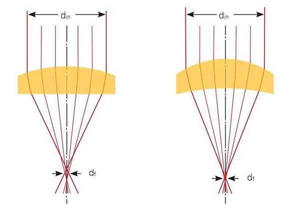 出于系统机械设计的考虑因素,往往会对透镜的焦距造成限制。例如,根据限制,聚焦透镜与工件之间的距离会有一个最小限度。在这种情况下,最实际的做法是,选择焦距符合系统机械部分限制条件的透镜,然后根据该透镜改变输入光束的直径,以尽可能地减小焦点尺寸。