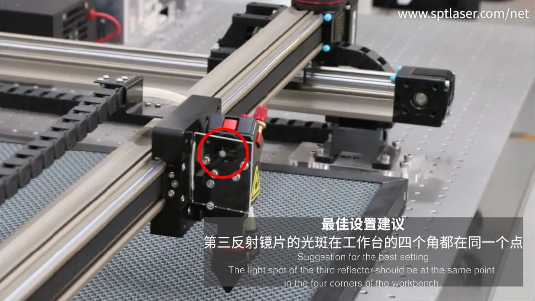 光路最佳设置建议:第三反射镜片的光斑在工作台的四个角均落在同一个点。