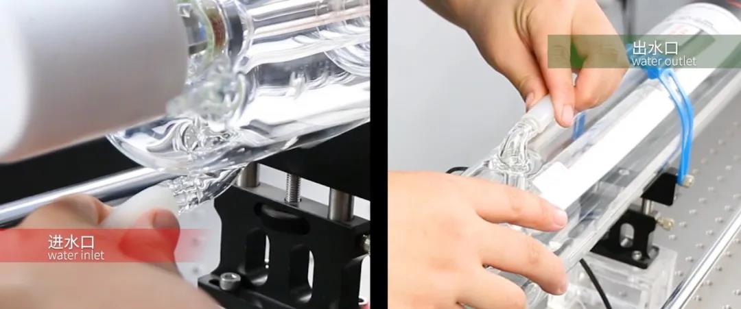 安装激光管时,注意要将激光管的标签朝上。注意进出水管的接法,必须遵循低进高出的原则。